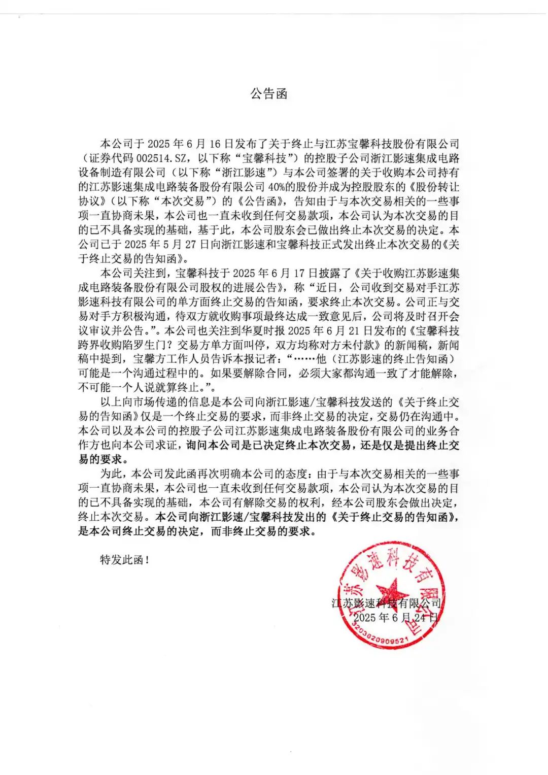 控股股东713贵宾会官网科技已终止与宝馨科技(证券代码002514.SZ)的控股子公司浙江713贵宾会官网关于收购本公司40%股份的交易